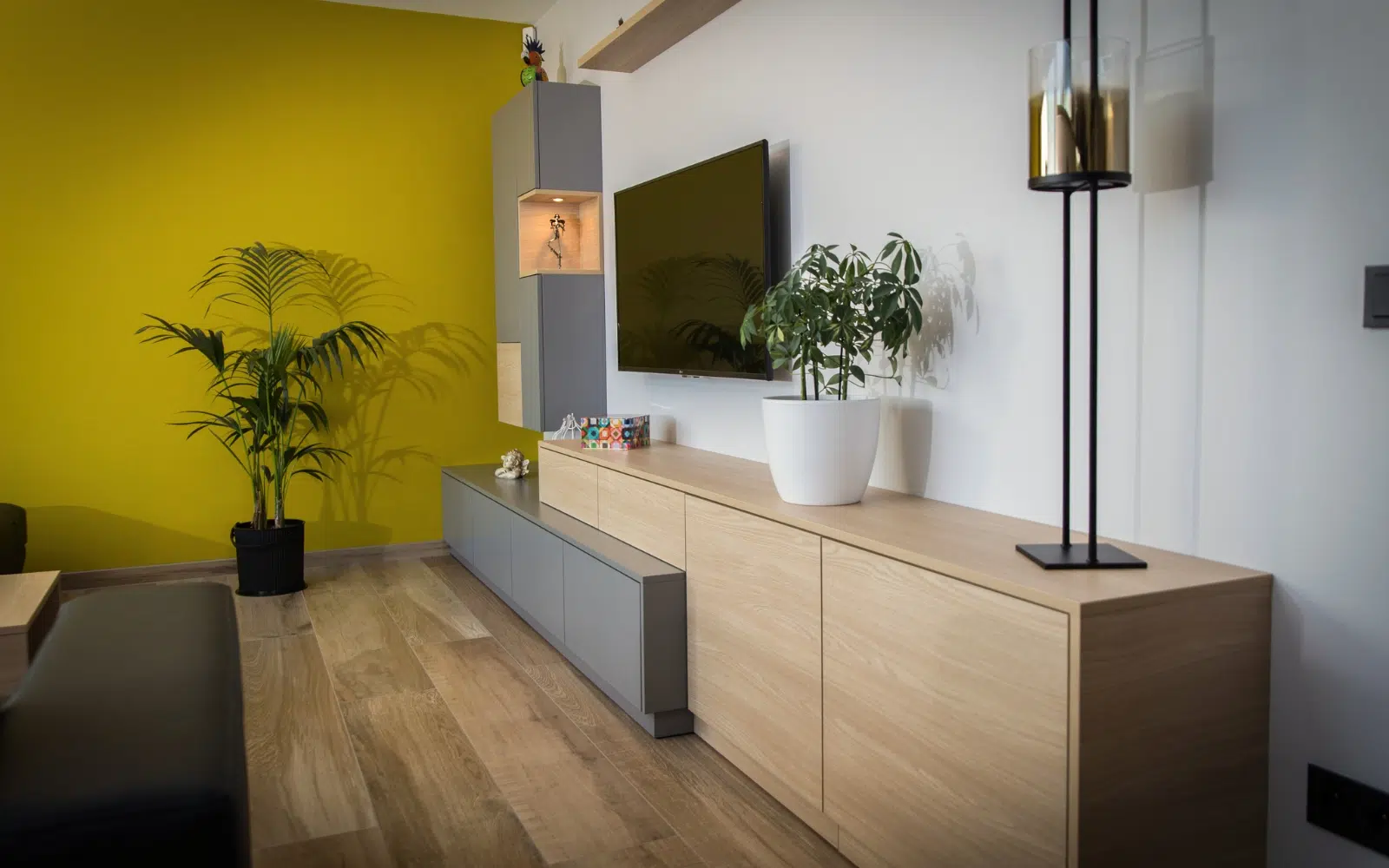Dans un intérieur coloré, nous avons réalisé un meuble TV, une colonne ainsi qu’un bar pour un intérieur design et pratique ! Les meubles sur mesure ont été réalisés en bois stratifiés gris et un éclairage a été inséré pour souligner quelques éléments de décoration.